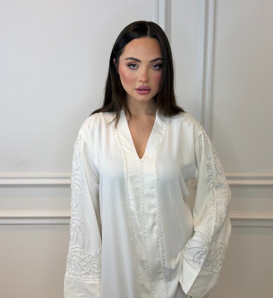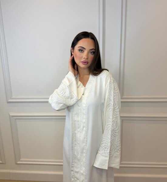 Elegant white Abaya crafted from high-quality, flowing crepe fabric. Beautifully finished with handcrafted bead embellishments for a subtle touch of luxury. The lightweight, graceful silhouette ensures comfort and timeless elegance – perfect for both special occasions and refined everyday wear.