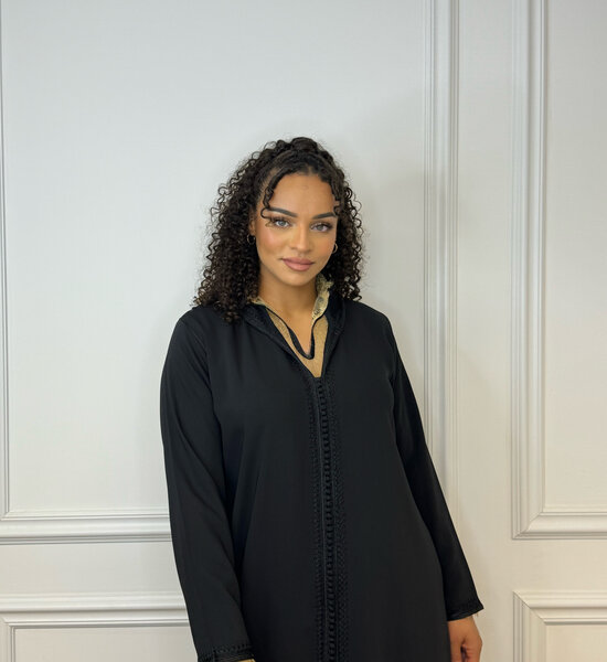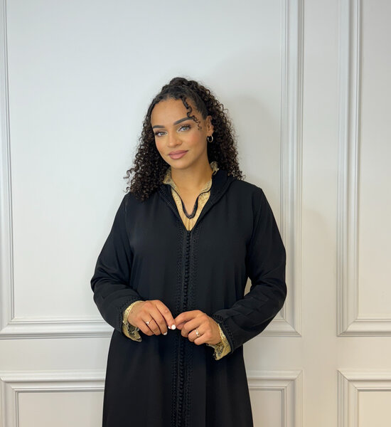 This two-piece black djellaba is a stunning example of Moroccan elegance and craftsmanship. The djellaba consists of an outer layer and a gold lace underdress, which together create a refined and luxurious look. The black djellaba itself is made from high-quality fabric and adorned with subtle, graceful details that honor the traditional design. The gold lace underdress adds an extra touch of glamour with its delicate lacework and rich color. The model in the photo is wearing a size L, demonstrating how this stylish outfit offers a flattering fit for various body shapes. This djellaba is perfect for special occasions where a chic and classic appearance is desired