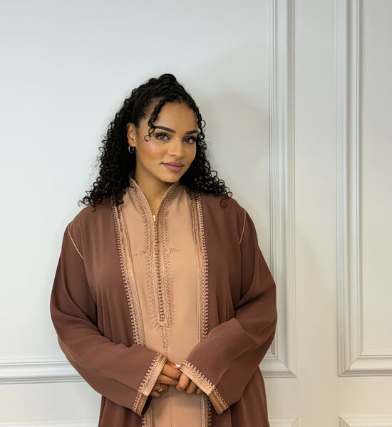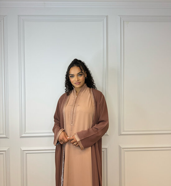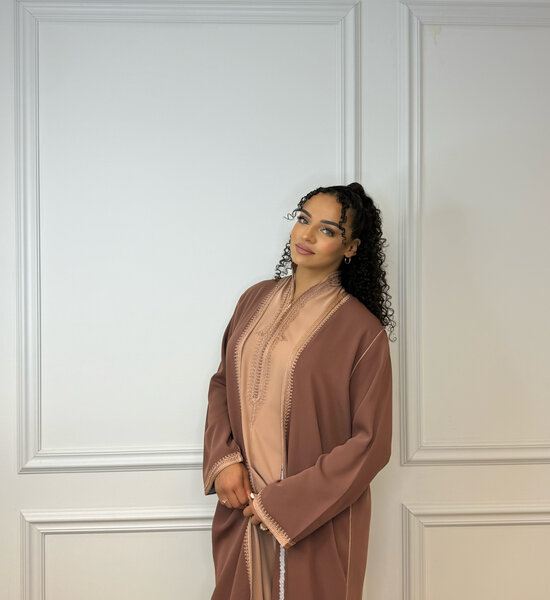 This two-piece djellaba features a nude underdress paired with an elegant brown outer layer. The detailing is beautifully finished with sfifa in the same color as the underdress, creating a harmonious and refined look. The model in the photo usually wears a size S. This stylish design is perfect for special occasions where a chic and elegant appearance is desired.