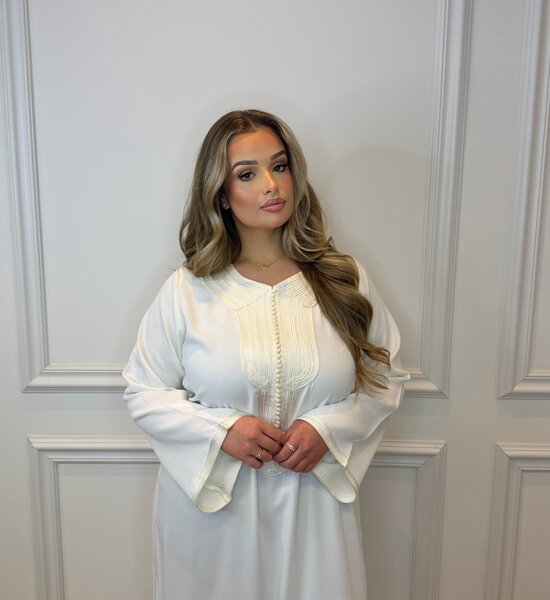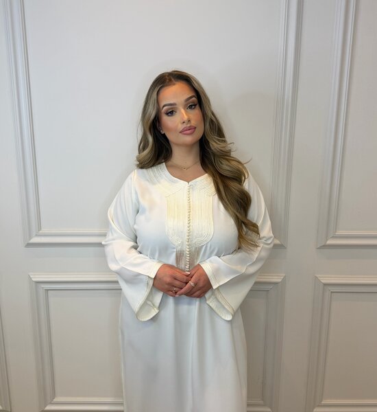 Stijlvolle wit Abaya met subtiele, verfijnde Sfifa afwerking. Het minimalistische ontwerp straalt klasse en tijdloze elegantie uit. Dankzij de soepele pasvorm en rustige uitstraling is deze djellaba perfect voor zowel dagelijkse elegantie als ingetogen feestelijke momenten.
