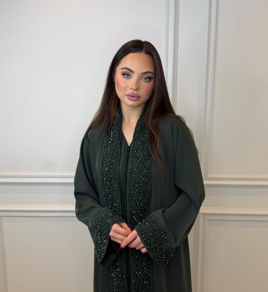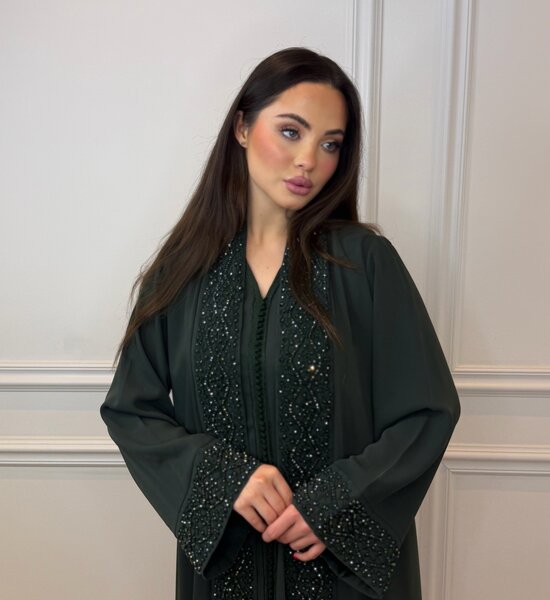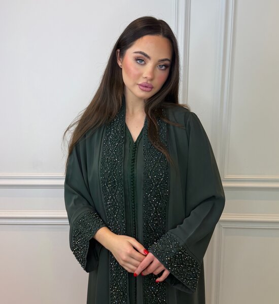 Prachtige 2-delige kimono-stijl djellaba in smaragd groene kleur, met bijpassende onderjurk. Versierd met fijn smaragd groene kralenhandwerk voor een subtiele, luxueuze uitstraling. Lichtgewicht, comfortabel en ideaal voor feestelijke of stijlvolle dagelijkse looks.