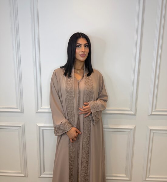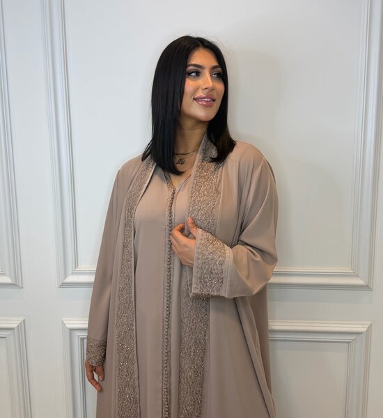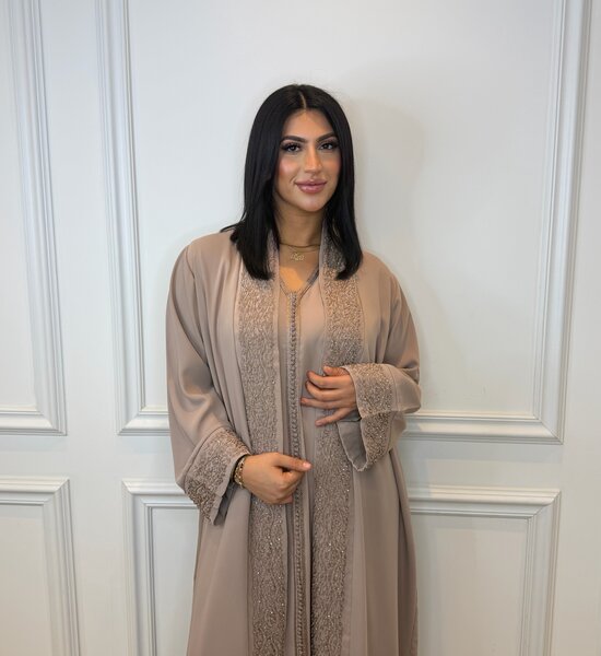 Prachtige 2-delige kimono-stijl djellaba in nude kleur, met bijpassende onderjurk. Versierd met fijn nude kralenhandwerk voor een subtiele, luxueuze uitstraling. Lichtgewicht, comfortabel en ideaal voor feestelijke of stijlvolle dagelijkse looks.
