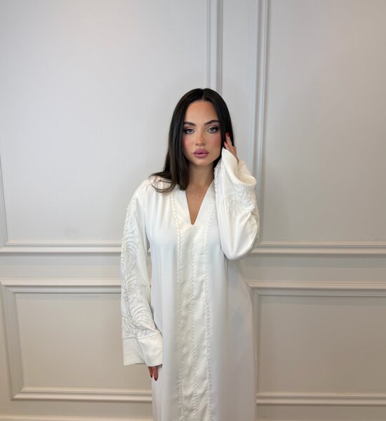 Elegante witte Abaya vervaardigd uit hoogwaardige, soepelvallende crêpe stof. Verfijnd afgewerkt met handgemaakte kralenborduring voor een subtiele luxe uitstraling. De lichte, vloeiende pasvorm zorgt voor comfort en tijdloze elegantie – perfect voor zowel speciale gelegenheden als stijlvolle dagelijkse momenten.