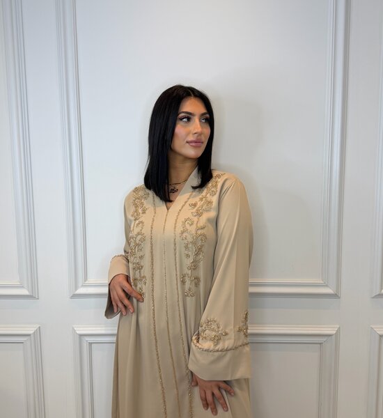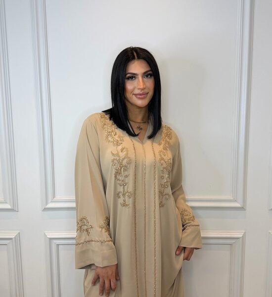 Stijlvolle Marokkaanse Djellaba in zachte beige kleur, verrijkt met verfijnd goudkleurig Tarz borduurwerk. De voorzijde is afgewerkt met klassieke Sfifa en fijne Aakad details. Een minimalistisch maar luxueus ontwerp met een elegante, losse snit.