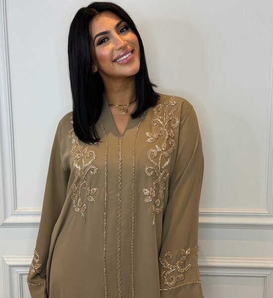 Elegante 1-delige abaya in diepe beige kleur , voorzien van verfijnd handgemaakt kralenwerk voor een luxe, feestelijke uitstraling. Lichtgewicht, comfortabel en perfect voor speciale gelegenheden of stijlvolle dagelijkse looks.