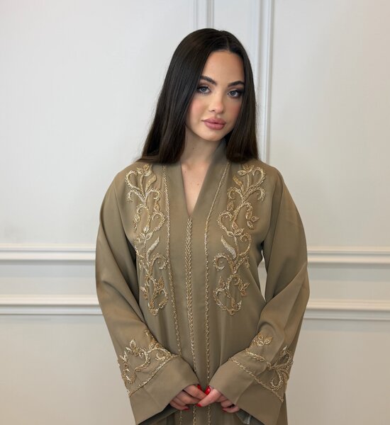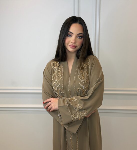 Luxe beige Abaya vervaardigd uit soepelvallende crêpe stof, rijkelijk versierd met handgemaakt kralenwerk. Het verfijnde handwerk geeft de abaya een elegante en exclusieve uitstraling. De zachte tint in combinatie met de vloeiende pasvorm zorgt voor een tijdloze en vrouwelijke look – perfect voor feestelijke gelegenheden.