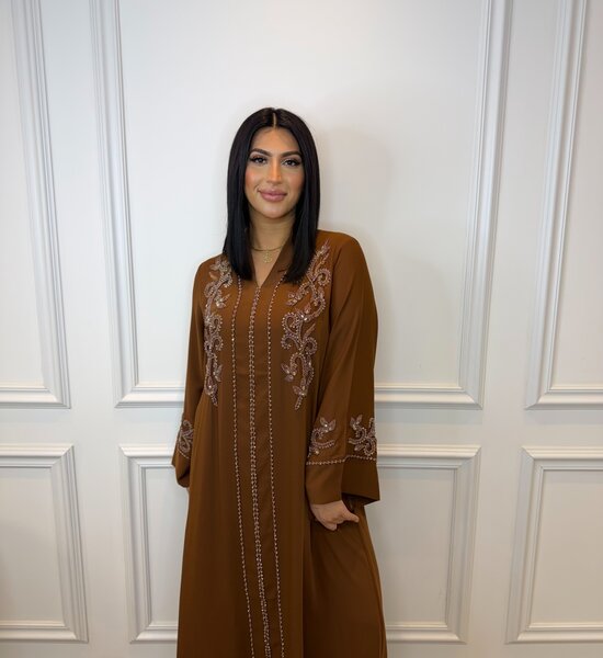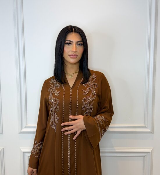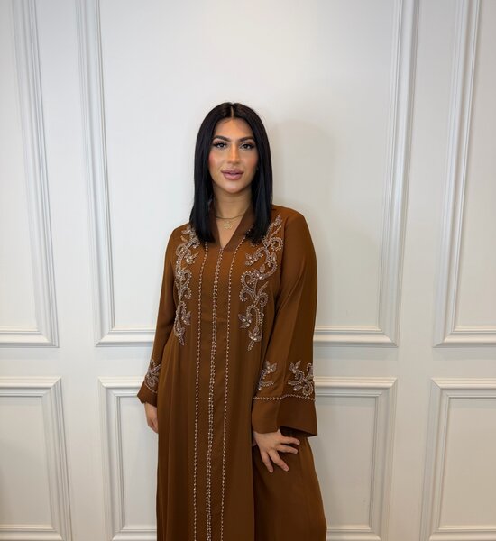 Elegante 1-delige abaya in diepe caramel kleur , voorzien van verfijnd handgemaakt kralenwerk voor een luxe, feestelijke uitstraling. Lichtgewicht, comfortabel en perfect voor speciale gelegenheden of stijlvolle dagelijkse looks.