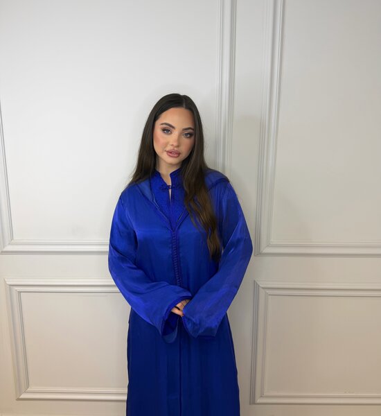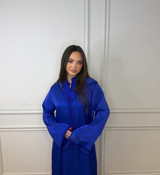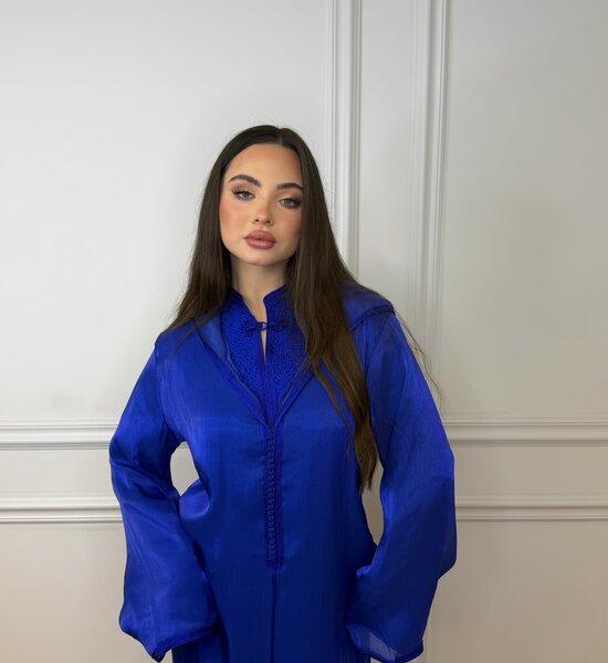 Elegante 2-delige koningsblauwe Djellaba met een verfijnde combinatie van stoffen. De onderzijde is vervaardigd uit soepelvallende crêpe stof, terwijl de bovenzijde is afgewerkt in luxe transparante organza. De hoge kraag geeft het ontwerp een moderne en krachtige uitstraling. Een stijlvolle mix van klassiek en eigentijds – perfect voor speciale gelegenheden.