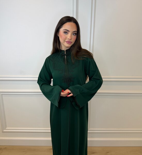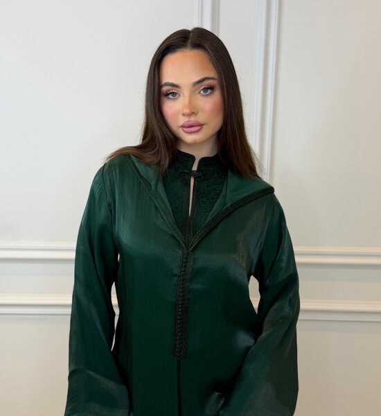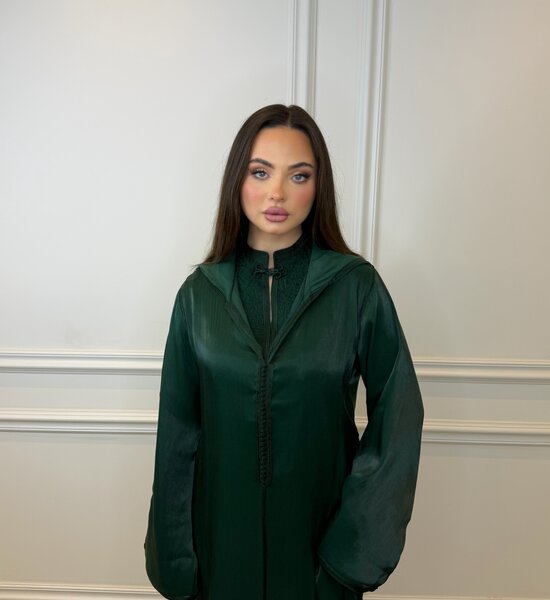 Elegante 2-delige smaragd groene Djellaba met een verfijnde combinatie van stoffen. De onderzijde is vervaardigd uit soepelvallende crêpe stof, terwijl de bovenzijde is afgewerkt in luxe transparante organza. De hoge kraag geeft het ontwerp een moderne en krachtige uitstraling. Een stijlvolle mix van klassiek en eigentijds – perfect voor speciale gelegenheden.