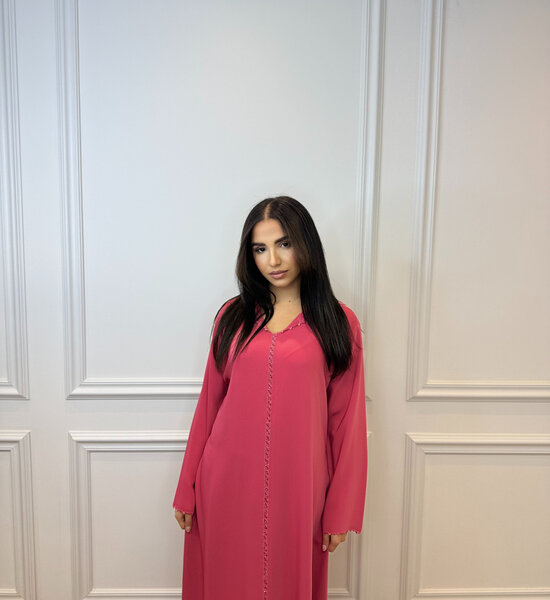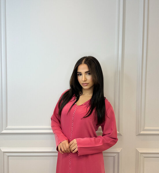 Deze prachtige eendelige djellaba komt in een unieke koraalroze kleur, afgewerkt met verfijnde handbewerkte Randa. De speelse tint en de zorgvuldige afwerking maken dit een opvallende keuze voor elke speciale gelegenheid. Het model op de foto draagt normaal maat S, wat de veelzijdigheid en elegantie van deze djellaba benadrukt. Perfect voor wie op zoek is naar iets bijzonders en stijlvols.