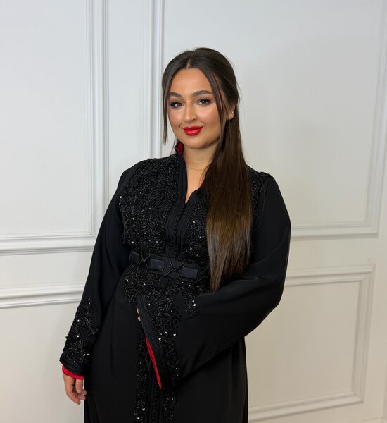 Stijlvolle zwarte Kaftan vervaardigd uit soepelvallende crêpe stof. De contrasterende rode voering geeft een elegante en verfijnde touch, terwijl de hoge kraag zorgt voor een krachtige, moderne uitstraling. Een tijdloos ontwerp met een luxe afwerking – perfect voor formele gelegenheden en avondmomenten.