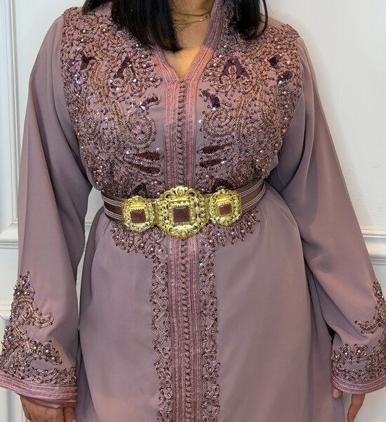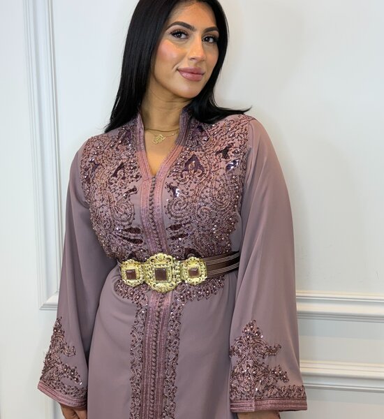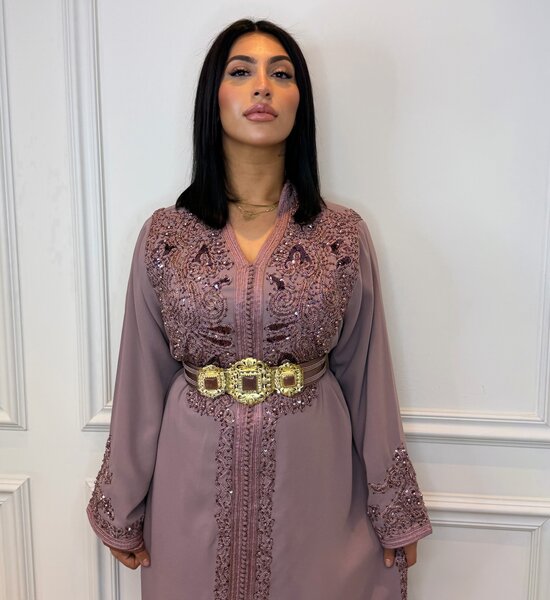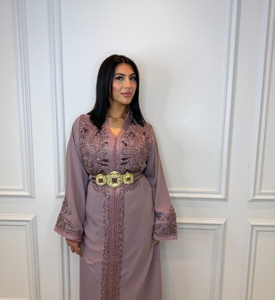 Luxe paars/lila Kaftan verfijnd met exclusief Caterfield handwerk en subtiele kralenborduring. Het ambachtelijke detailwerk geeft de kaftan een rijke en elegante uitstraling. De soepele pasvorm en zachte tint zorgen voor een vrouwelijke, verfijnde look – ideaal voor bruiloften en feestelijke gelegenheden.