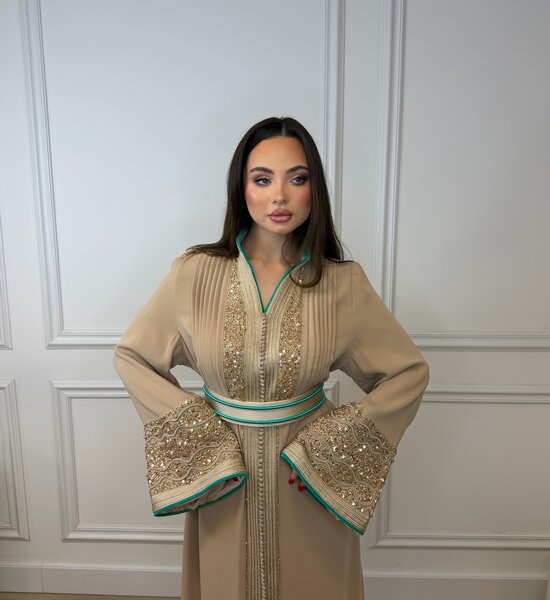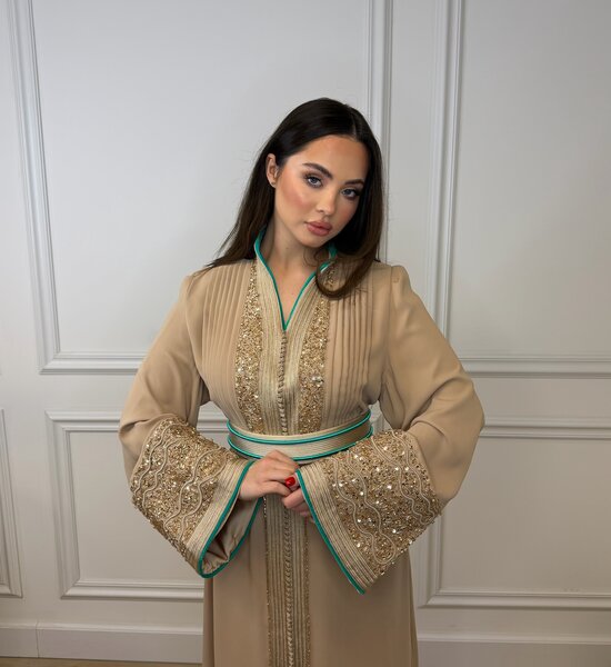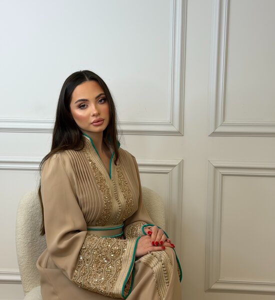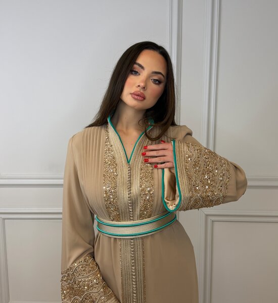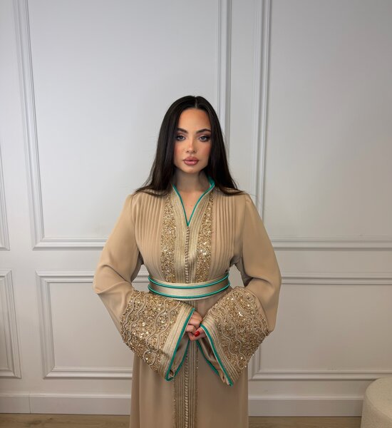 Luxe Nude Kaftan verfijnd met nude kleurige handwerk en elegante kralenborduring. De subtiele turquoise afwerking in de voering geeft een stijlvol contrast, terwijl de hoge kraag zorgt voor een krachtige en verfijnde uitstraling. Een tijdloos en chic ontwerp – perfect voor bijzondere gelegenheden.