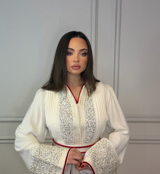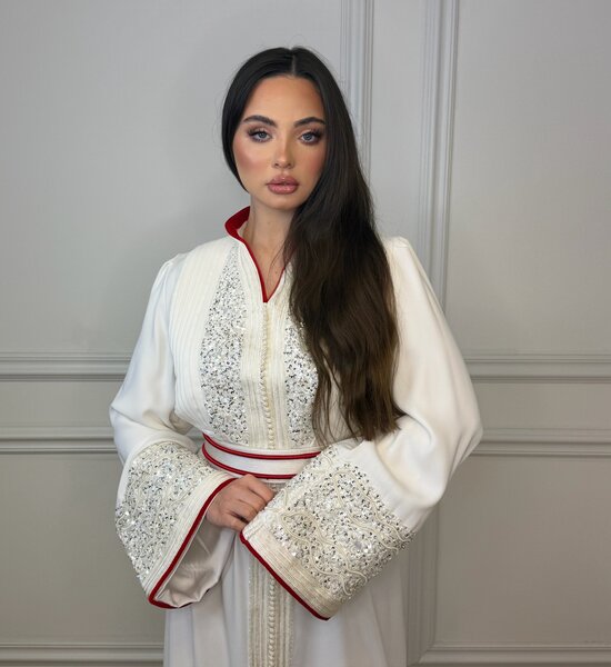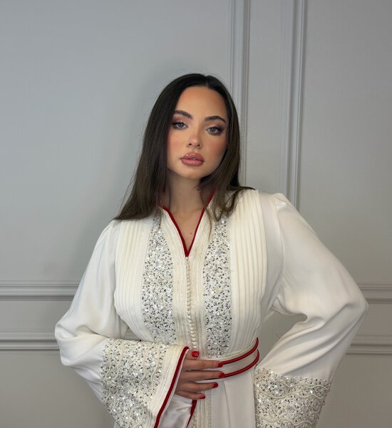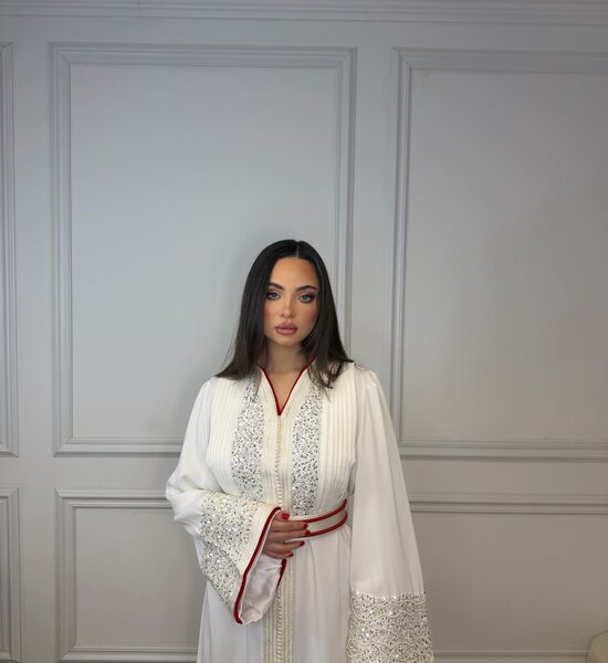 Luxe witte Kaftan verfijnd met zilverkleurig handwerk en elegante kralenborduring. De subtiele rode afwerking in de voering geeft een stijlvol contrast, terwijl de hoge kraag zorgt voor een krachtige en verfijnde uitstraling. Een tijdloos en chic ontwerp – perfect voor bijzondere gelegenheden.
