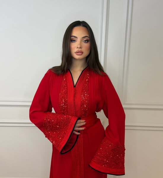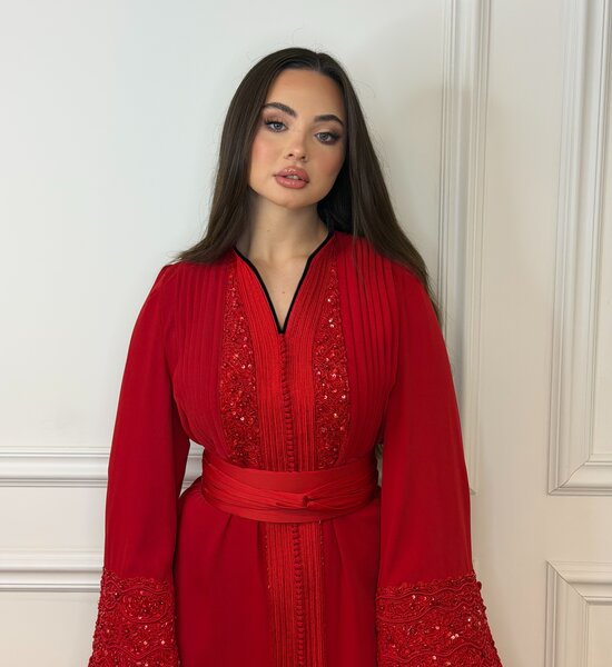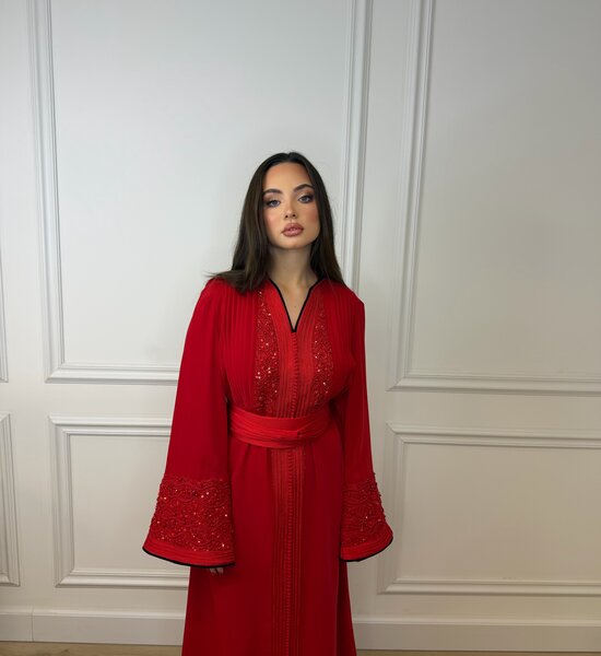 Luxe rode Kaftan verfijnd met rode handwerk en elegante kralenborduring. De subtiele zwarte afwerking in de voering geeft een stijlvol contrast, terwijl de hoge kraag zorgt voor een krachtige en verfijnde uitstraling. Een tijdloos en chic ontwerp – perfect voor bijzondere gelegenheden.